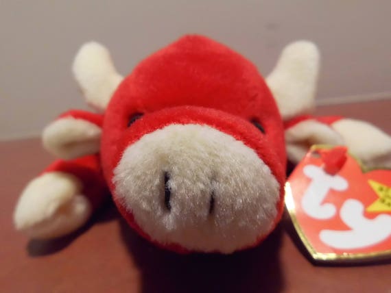 Claude the Crab Value. Her eyes are closed and the poem inside her tush tag is of course a hopeful one. This item can be shipped to United States. The two bulls were very similar and share a birthday but Snort has colored hooves while Tabasco does not. The spunky-looking Snort the Red Bull received his name in a rather odd fashion. Snort the Red Bull. Was about to be hit with a copyright infringement lawsuit that involved the companys then-named Tabasco the Bull beanie baby. Ringo Baby Racoon Beanie Baby. The seller is first1_2010 and is located in Austin Texas.